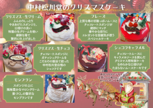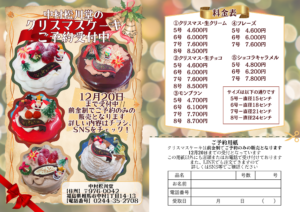 2025/11/13 現在、クリスマスケーキの予約を絶賛受付中🎄 店頭ではクリスマスケーキの紹介と予約表がついたチラシを無料で配布中です。 クリスマスケーキ用の無料チラシの内容はこちら↓ (画像をタップまたはクリックすると、さらに大きな画面で表示されます)