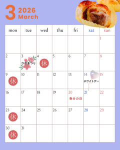3月の店休日は少し変則的で、4日(水)、9日(月)、23日(月)、30日(月)が休みとなっています。